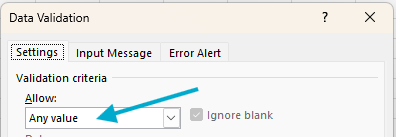 Click on the Data Validation button and you get the “Validation criteria” window, where you choose what to allow. By default, it is “Any value”: