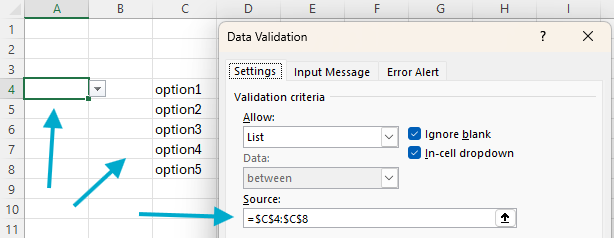 Note also the “In-cell dropdown” checkbox: it must be checked to get an in-cell dropdown (this is the default). You have few ways to enter the Source, and I will provide some tips about it. I start with the most scalable approach and I present some shortcuts later.