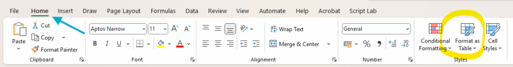 - Click “Format as Table” in the ribbon. In the popup that comes up, select “My Table has headers”.
