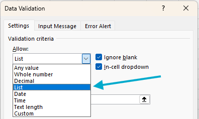 For in-cell dropdown lists, select “List” from the “Allow” options: