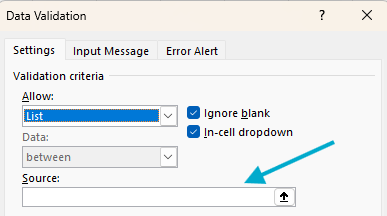You can now use the Table you just created for data validation. Start where we left off earlier, the Source field in the Data Validation window: