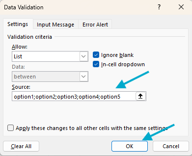 Then, in the Data Validation window, click inside the “Source” field and select the range where you entered the values: